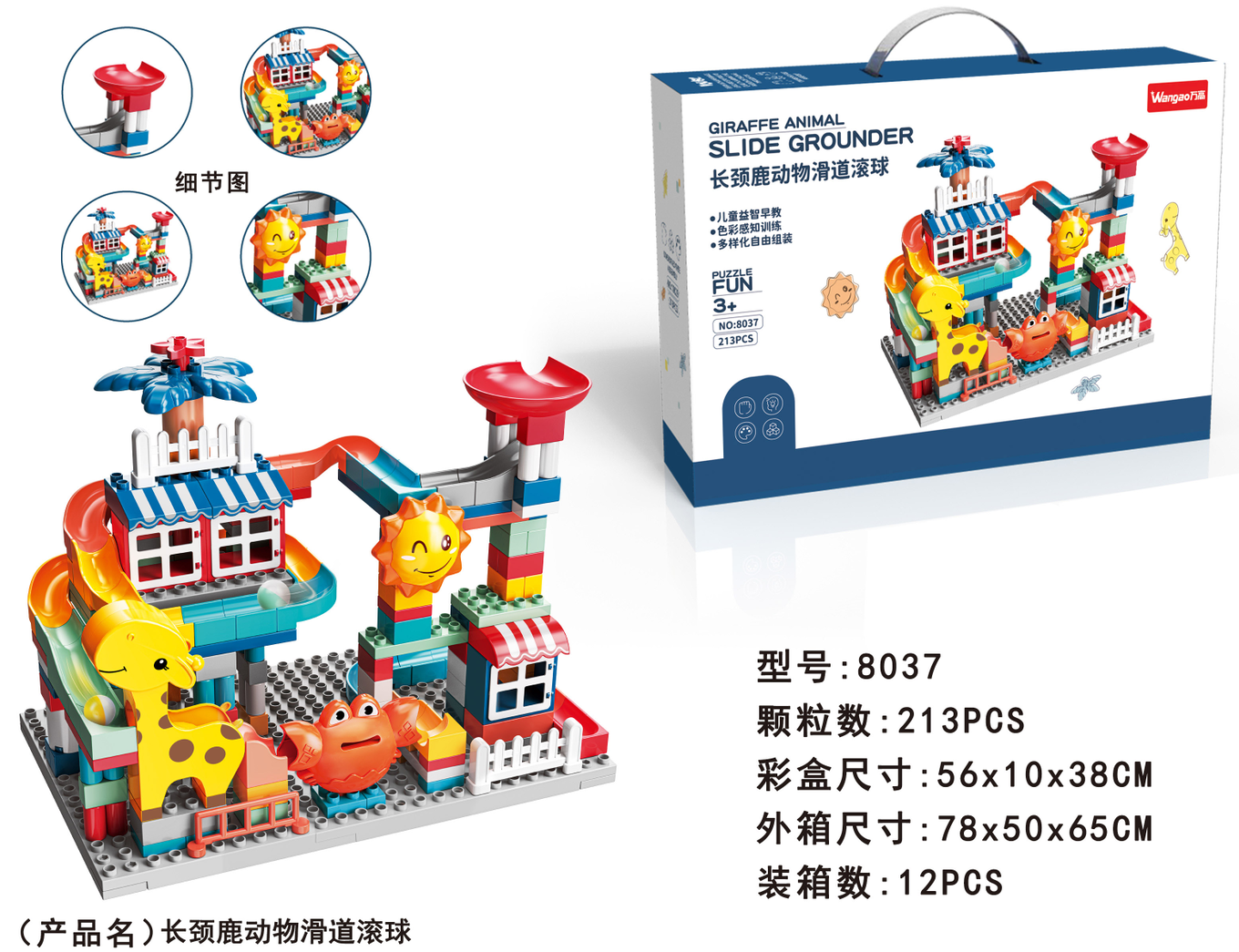 品 名:長(zhǎng)頸鹿動(dòng)物滑道滾球213顆粒